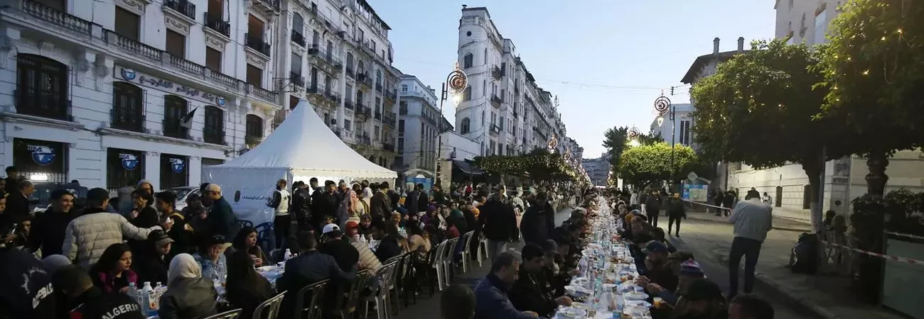الجزائر کے دارلحکومت الجزائرکے مرکزی علاقے میں لوگ رمضان کےدوران افطارکررہےہیں۔(شِنہوا)