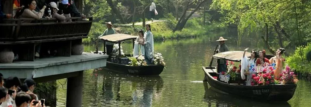 چین، مشرقی صوبہ ژے جیانگ کے صدرمقام ہانگ ژو کے شی شی ویٹ لینڈ میں سیاح چینی روایتی لباس ہان فو کو دیکھ رہے ہیں۔(شِنہوا)
