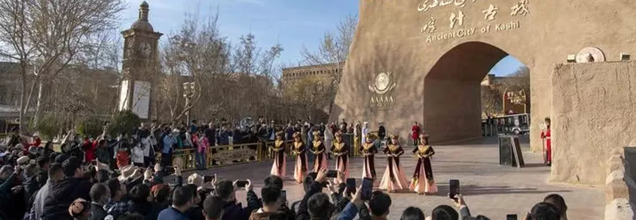 چین ، شمال مغربی سنکیانگ ویغور خوداختیار خطے کے قدیم شہر کاشغر کے دروازے پر سیاح فن کا مظاہرہ دیکھ رہے ہیں۔ (شِںہوا)
