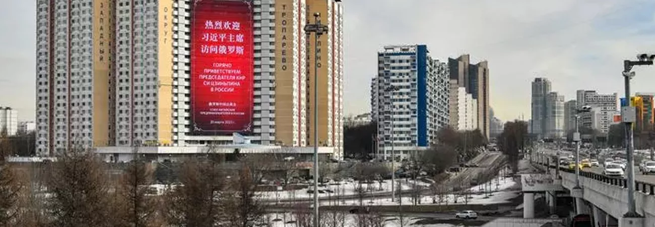 روس، ماسکو میں چینی صدر شی جن پھنگ کے لئے آویزاں خیرمقدمی پیغام دیکھا جاسکتا ہے۔ (شِںہوا)