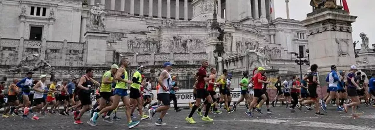 اٹلی کے شہرروم میں 28ویں روم میراتھن کے دوران دوڑ میں شریک افراد پیازا وینزیا کے پاس سے گزر رہے ہیں۔(شِنہوا)