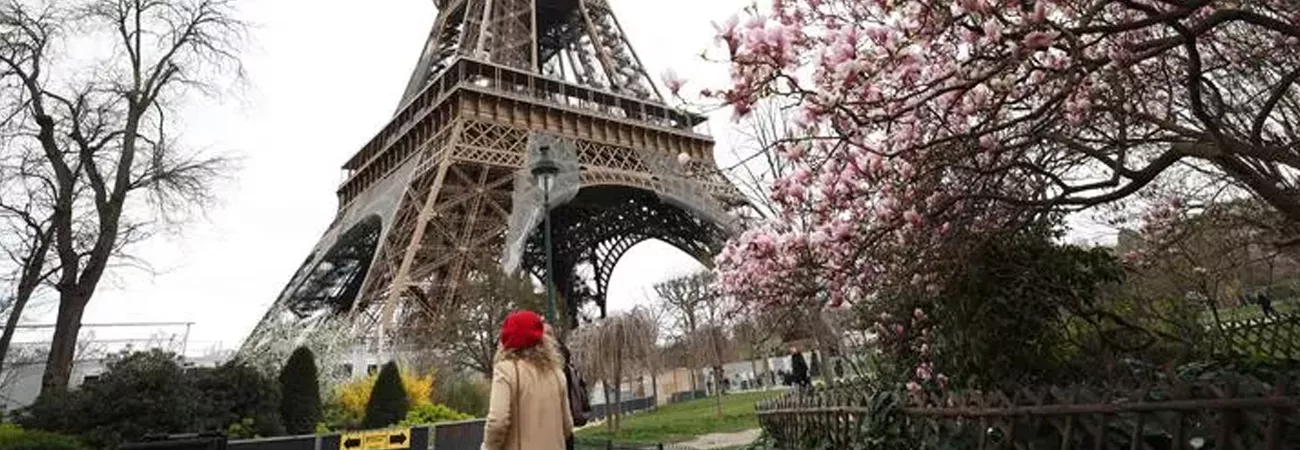 فرانس کے شہر پیرس میں ایفل ٹاور کے قریب چیمپ ڈی مارس پر ایک خاتون میگنولیا کے پھولوں کے پاس سے گزر رہی ہے۔(شِنہوا)