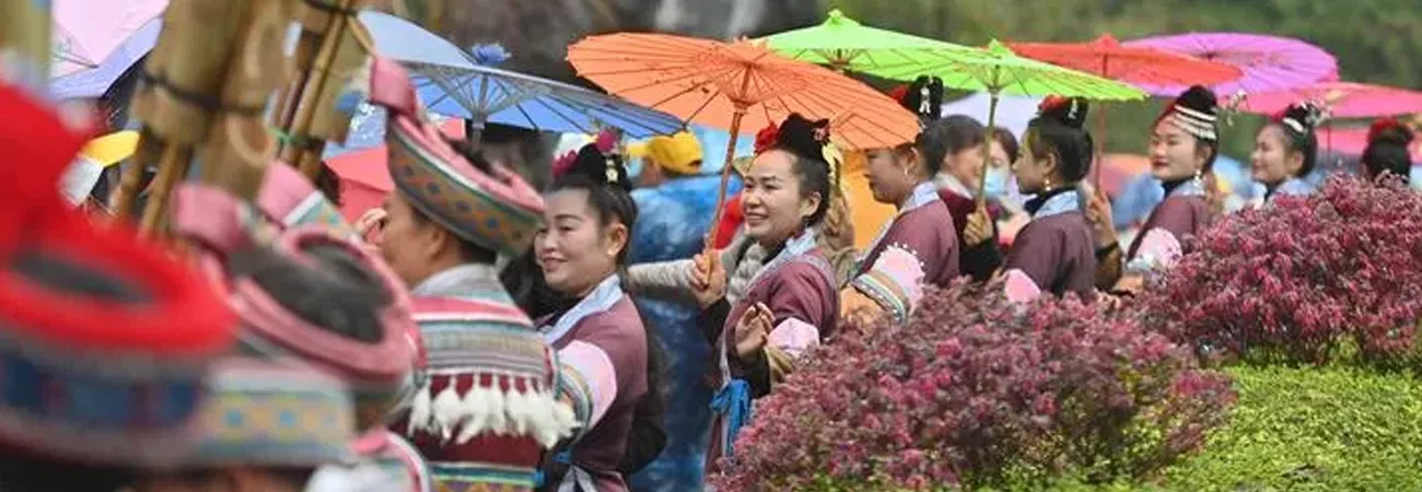 چین، جنوبی گوانگ شی ژوانگ خوداختیار خطے کی رونگ شوئی میاؤ خوداختیار کاؤنٹی کے خوبصورت مقام پر میاؤ نسلی گروہ کے افراد جنوبی صوبہ گوانگ ڈونگ کے شہر ژین جیانگ سے تعلق رکھنے والے سیاحوں کا خیرمقدم کررہے ہیں ۔ (شِنہوا)