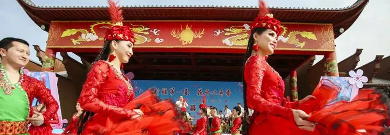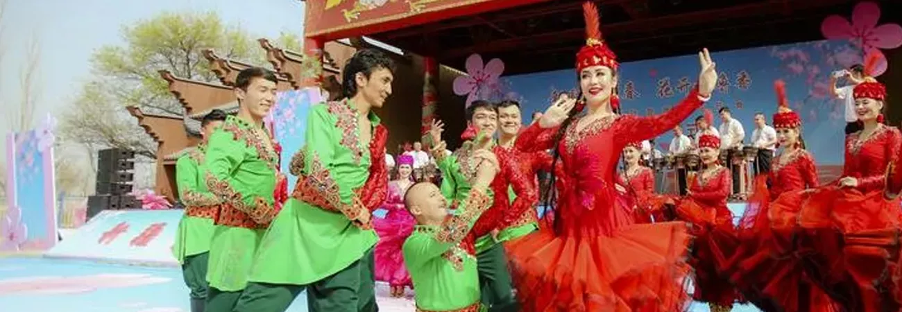 چین ، شمال مغربی سنکیانگ ویغور خوداختیار خطے کے شہر تورپان کی توک سان کاؤنٹی میں رقاص خوبانی کھلنے کے میلے کی افتتاحی تقریب میں فن کا مظاہرہ کررہے ہیں۔ (شِنہوا)