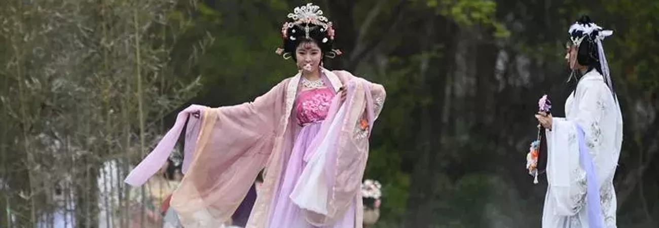 چین ، مشرقی صوبہ ژے جیانگ کے شہر ہانگ ژو میں واقع شی شی قومی ویٹ لینڈ پارک میں  خواتین روایتی لباس میں سیاحوں کے لئے فن کا مظاہرہ کررہی ہیں۔(شِنہوا)