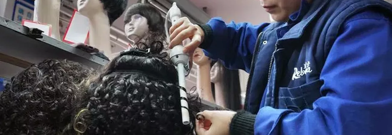 چین کے وسطی صوبے ہینان کے شہرشوچھانگ  میں ہینان ریبیکا ہیئر پروڈکٹس کمپنی لمیٹڈ کی ورکشاپ میں ایک کارکن وِگ بنا رہی ہے۔(شِنہوا)
