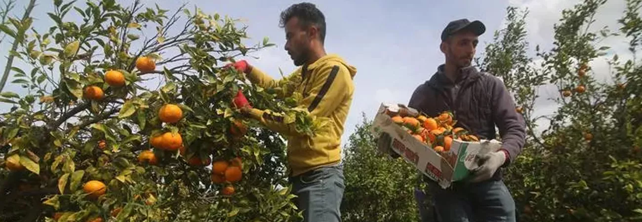 غزہ کی  پٹی کے جنوبی شہر خان یونس کے ایک فارم میں فلسطینی باغ میں مالٹے توڑ رہے ہیں۔(شِنہوا)