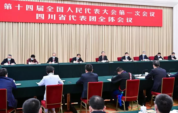 چین ، دارالحکومت بیجنگ میں منعقدہ 14 ویں قومی عوامی کانگریس کے پہلے اجلاس میں کمیونسٹ پارٹی آف چائنہ کی مرکزی کمیٹی کے سیاسی بیورو کی قائمہ کمیٹی کے رکن ژاؤ لی جی نے صوبہ سیچھوان کے نائبین کے ساتھ غورو خوض میں حصہ لیا۔ (شِنہوا)