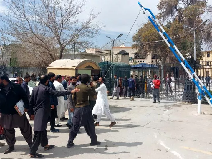 بلوچستان کے ضلع بولان میں لوگ ہسپتال کے باہر جمع ہیں جہاں پیر کوایک خودکش حملے میں 9 سیکیورٹی اہلکار جاں بحق اور10زخمی ہوئے۔(شِنہوا)