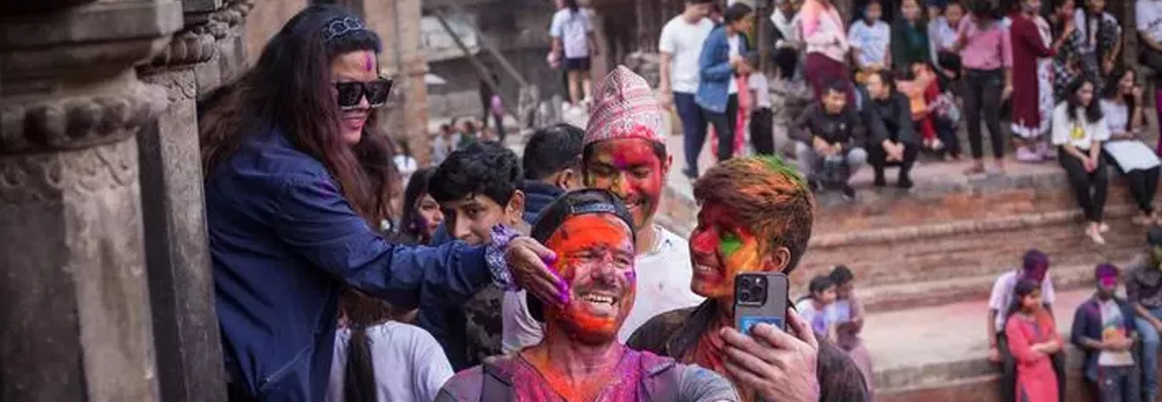 نیپال کے للت پور کے پٹن دربار اسکوائر پر ہولی کے تہوار کے موقع پر لوگ رنگین پاؤڈر لگا کرسیلفیاں لے رہے ہیں۔(شِنہوا)