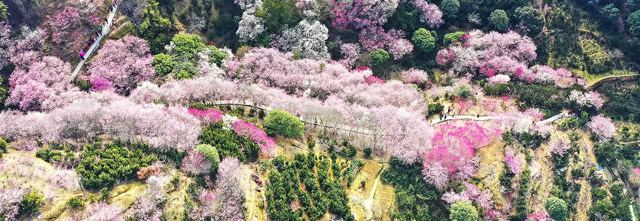 چین، جنوب مشرقی صوبہ فوجیان کی کاؤنٹی یونگ تائی کے گاؤں داشی میں آلوبخارے کے کھلتے پھول دیکھے جاسکتے ہیں۔(شِنہوا)