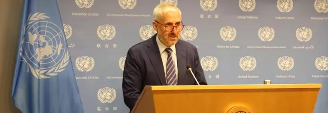 اقوام متحدہ کے سیکرٹری جنرل انتونیو گوتریس کے ترجمان سٹیفن ڈوجارک اقوام متحدہ ہیڈکوارٹرز میں پریس کانفرنس کرتے ہوئے۔(شِنہوا)