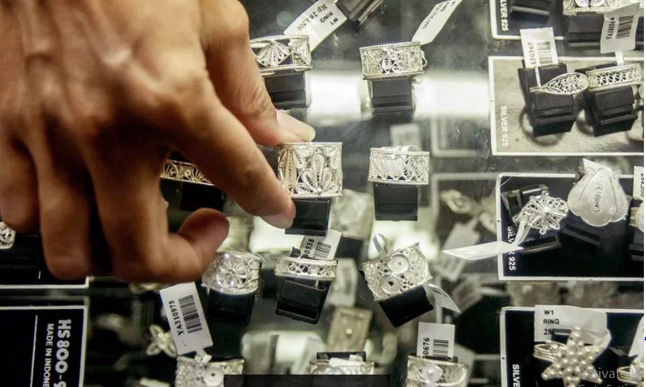 انڈونیشیا، یوگیا کارتا کے علاقے کوتاگیڈے میں زیورات کی دکان پر عملے کے ایک رکن نے چاندی کے زیو رات تھام رکھے ہیں۔(شِنہوا)