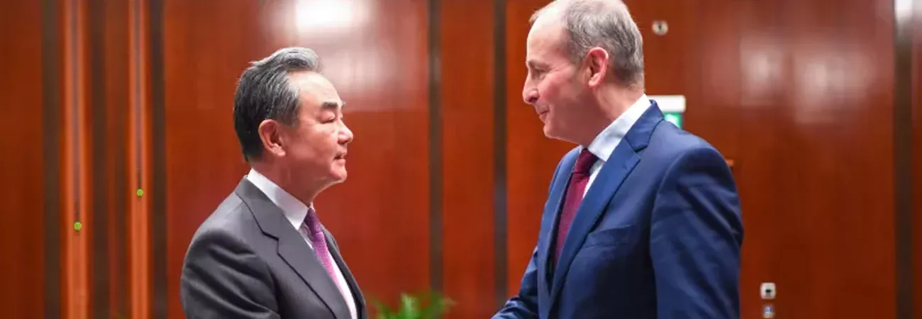 کمیونسٹ پارٹی آف چائنہ(سی پی سی) کی مرکزی کمیٹی کے خارجہ امور کمیشن کے دفتر کے ڈائریکٹر وانگ ای آئرلینڈ کے نائب وزیر اعظم اور وزیر برائے خارجہ امور و دفاع مائیکل مارٹن سے ملاقات کر رہے ہیں۔(شِنہوا)