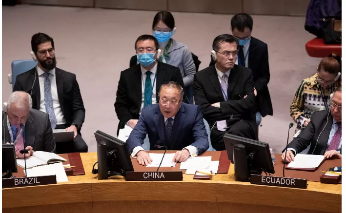 اقوام متحدہ میں چین کے مستقل نمائندے ژانگ جون (سامنے ،درمیان میں) سلامتی کونسل کے  اجلاس میں اظہار خیال کرتے ہوئے۔(شِنہوا)
