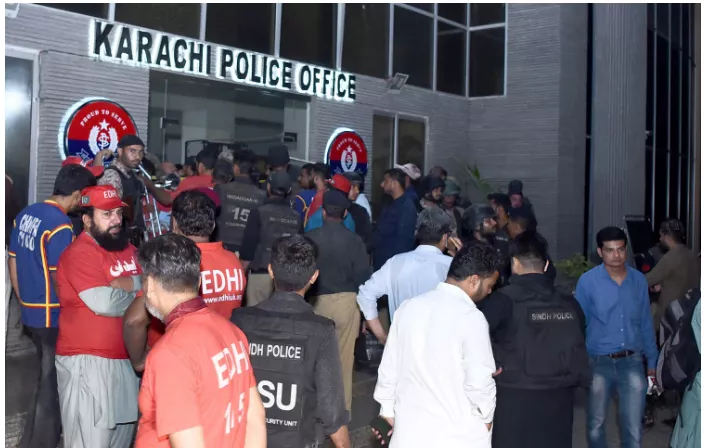 کراچی میں ایک حملے کے بعد لوگ پولیس کی عمارت کے باہر جمع ہیں۔(شِنہوا)