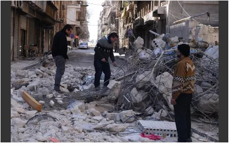 شام کے شہر حلب میں بے گھر افراد ایک منہدم عمارت کے ملبے میں اپنا سامان تلاش کر رہے ہیں۔(شِنہوا)
