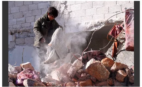 شام کے شہر حلب میں ایک بے گھر لڑکا منہدم عمارت کے ملبے سے اپنا سامان اکٹھا کر رہا ہے۔(شِنہوا)