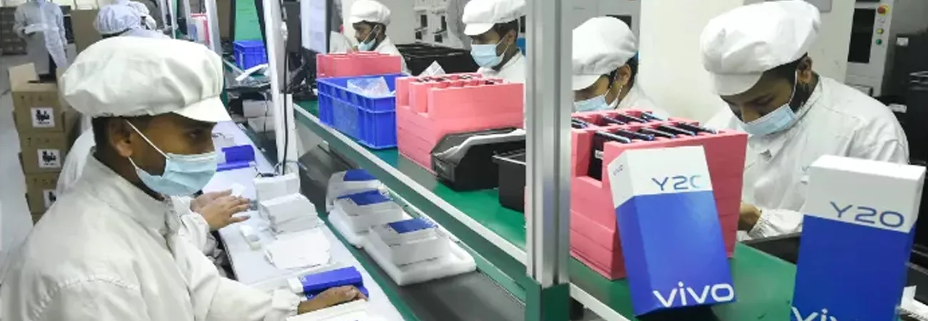 بنگلہ دیش کے دارالحکومت ڈھاکہ کے نواح میں نارائن گنج میں چینی موبائل فون ویوو کے پلانٹ میں مزدور اسمبلی لائن پر موبا ئل  پیک کررہے ہیں۔(شِنہوا)