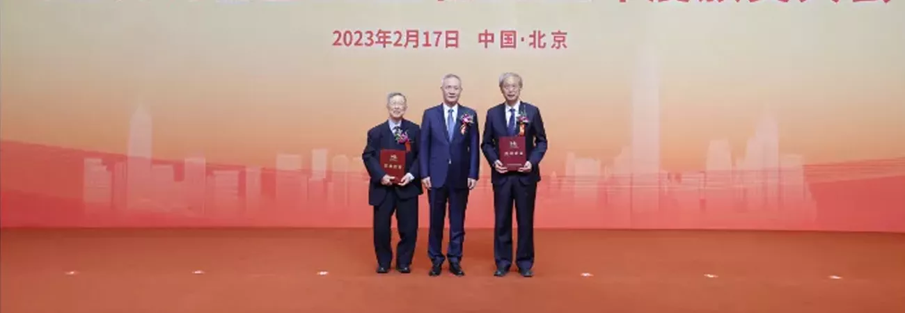 چینی نائب وزیر اعظم لیو ہی دارالحکومت بیجنگ میں  ایچ ایل ایچ ایل فاؤنڈیشن کی ایوارڈ تقریب میں سائنسدانوں ہوسائڈ(بائیں) اور لِن منگ (دائیں)کے ساتھ تصویر بنواتے ہوئے۔(شِنہوا)