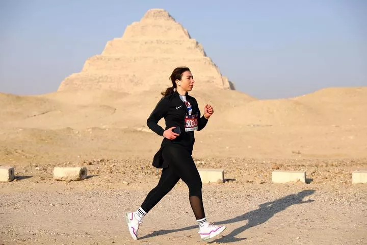 مصر کے دارالحکومت قاہرہ کے جنوب میں ہونے والی سقارہ اہرام ریس میں شریک ایک خاتون رنر کو دیکھا جاسکتا ہے۔(شِنہوا)