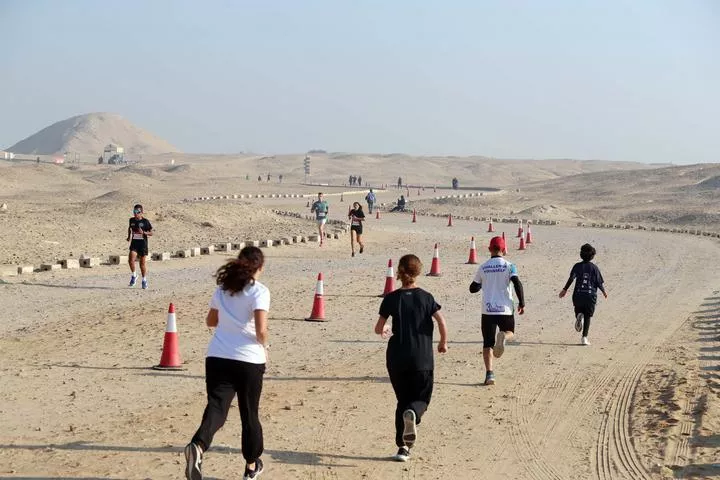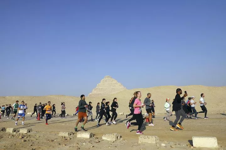 مصر کے دارالحکومت قاہرہ کے جنوب میں ہونے والی سقارہ اہرام ریس کے شرکا دوڑتے ہوئےدیکھے جاسکتے ہیں۔(شِنہوا)