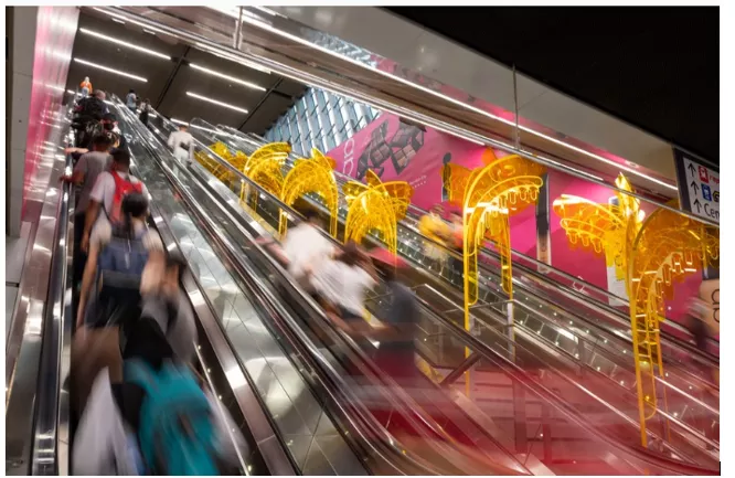 ملائیشیا، کوالالمپور میں پاسر سینی ایم آر ٹی اسٹیشن پر  مسافر "سنی سائیڈ اپ" آرٹ تنصیب سے گزر رہے ہیں۔(شِنہوا)