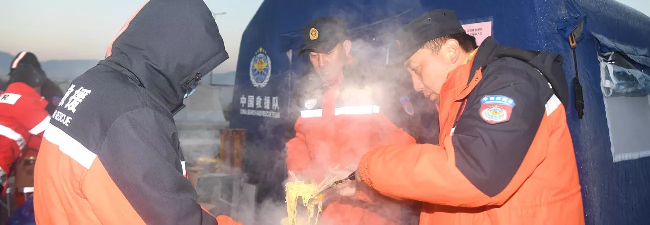 ترکی کے زلزلہ سے متاثرہ جنوبی صوبےہاتے کے شہرانطاکیہ  میں چین کی سرچ اینڈ ریسکیو ٹیم کے ارکان ایک کیمپ میں کھانا تقسیم  کر رہے ہیں۔(شِنہوا)