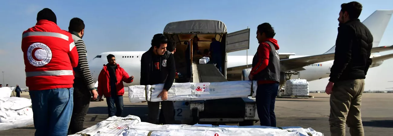شام کے زلزلہ متاثرین کی مدد  کے لیے چین کی جانب سے فراہم کردہ امدادی سامان دمشق کے ایئرپورٹ پر اتارا جارہا ہے۔(شِنہوا)