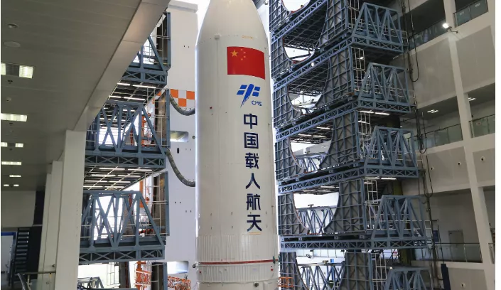 چین کے جنوبی صوبہ ہائی نان میں خلائی اسٹیشن لیب ماڈیول وینتیان اور لانگ مارچ-5بی وائی3 کیریئر راکٹ کے امتزاج کو لانچ کے علاقے میں منتقل کیا جا رہا ہے۔(شِنہوا)