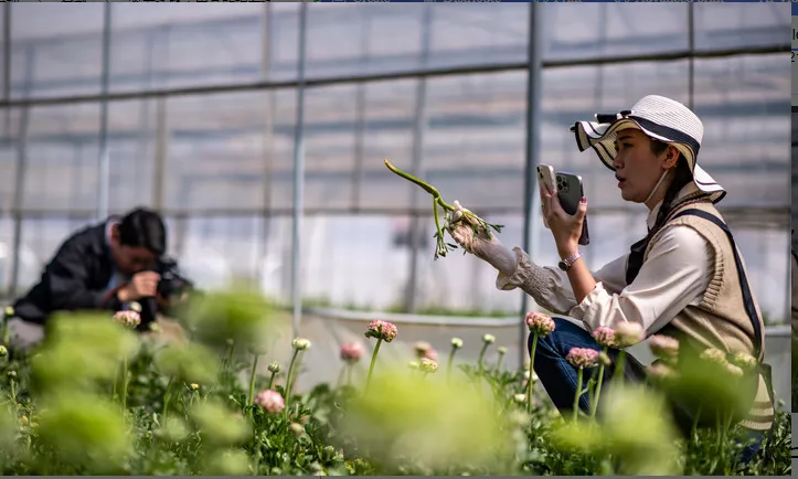 چین، جنوب مغربی صوبہ یون نان کے  چھوجنگ میں بی شی شی  پھولوں کے اپنے کھیت میں لائیو اسٹریمنگ شو کررہی ہے۔(شِنہوا)
