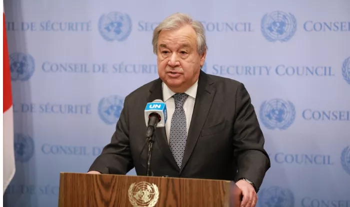 اقوام متحدہ کے سیکرٹری جنرل انتونیو گوتریس نیویارک میں اقوام متحدہ کے ہیڈ کوارٹر میں صحافیوں سے گفتگو کر رہے ہیں۔(شِنہوا)