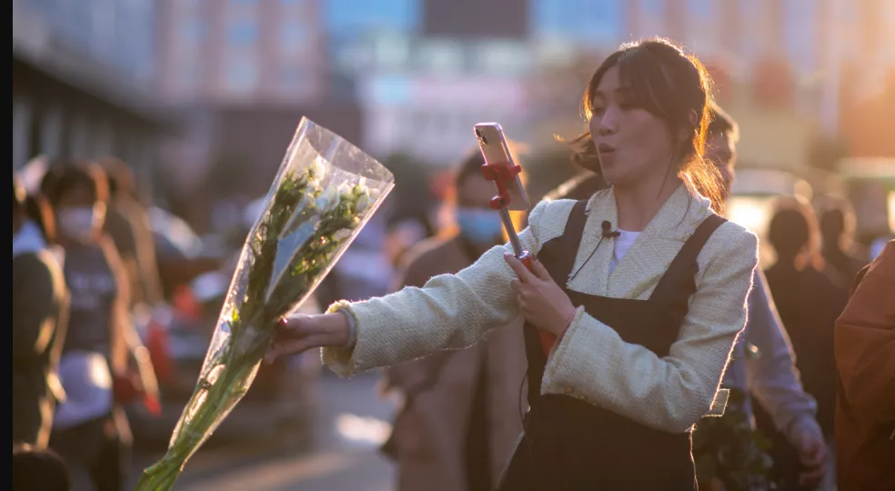 چین، جنوب مغربی صوبہ یون نان کے  کن منگ میں بی شی شی دونان فلاور ما رکیٹ سے لائیو اسٹریمنگ کے ذریعے تازہ پھول متعارف کرارہی ہے۔ (شِنہوا)