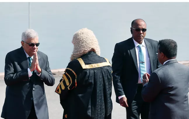 سری لنکاکےصدررانیل وکرما سنگھے ( بائیں سے پہلے) سری جے وردنے پورہ کوٹے میں پارلیمنٹ کے افتتاحی اجلاس میں شرکت کے لیے آرہے ہیں۔(شِنہوا)