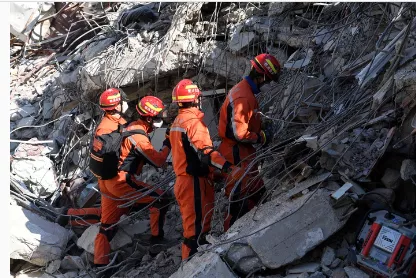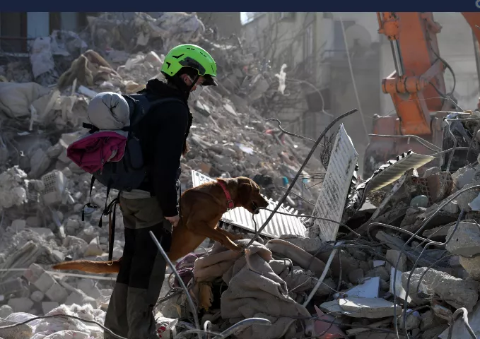 ترکی کے جنوبی صوبے ہاتے کے زلزلہ متاثرہ شہر انطاکیہ میں خاتون امدادی رکن اپنے کتے کے ساتھ  سرچ آپریشن میں مصروف ہے۔(شِنہوا)