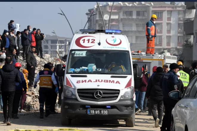 ترکی کے جنوبی صوبے ہاتے کے زلزلہ متاثرہ شہر انطاکیہ میں ملبے سے نکالے جانے والے افراد کواسپتال منتقل کرنے کے لیے ایک ایمبولینس کھڑی ہے۔(شِنہوا)