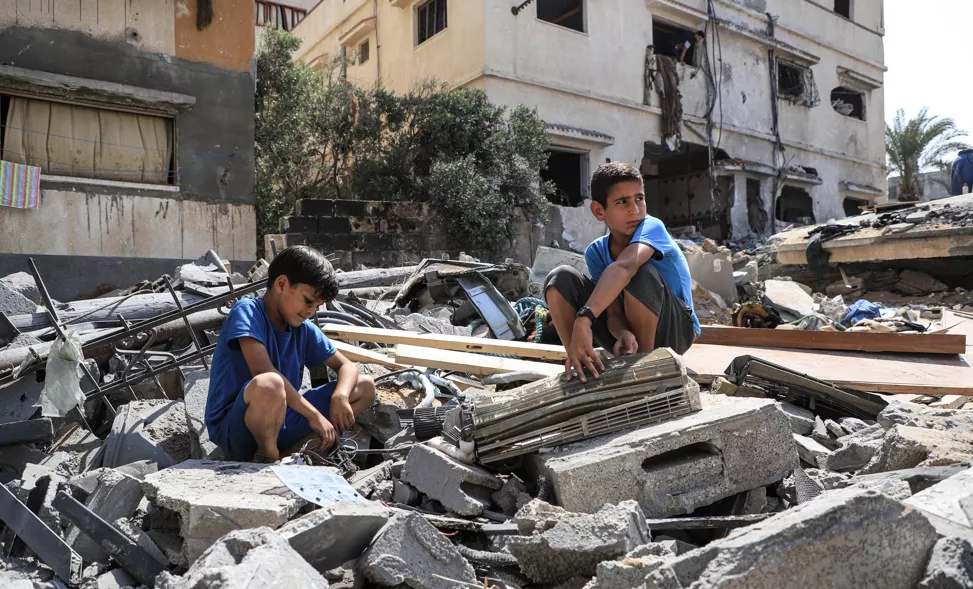 غزہ شہر میں فلسطینی بچےاسرائیلی فضائی حملے سے تباہ ہونے والے اپنے مکان کے ملبے پر بیٹھے ہیں۔(شِنہوا)