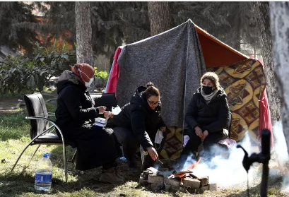 ترکی کے جنوبی صوبے ہاتے کے زلزلہ متاثرہ شہر انطاکیہ میں متاثرین عارضی کیمپ کے باہر بیٹھے ہیں۔(شِنہوا)