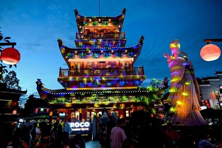 انڈونیشیا، جکارتہ کے کیلاپا گاڈنگ میں اولڈ شنگھائی سیڈا یو سٹی میں لوگ چینی افسانوی جانوروں کے لباس پہنے سیاحوں کو خوش آمدید کہہ رہے ہیں۔ (شِنہوا)