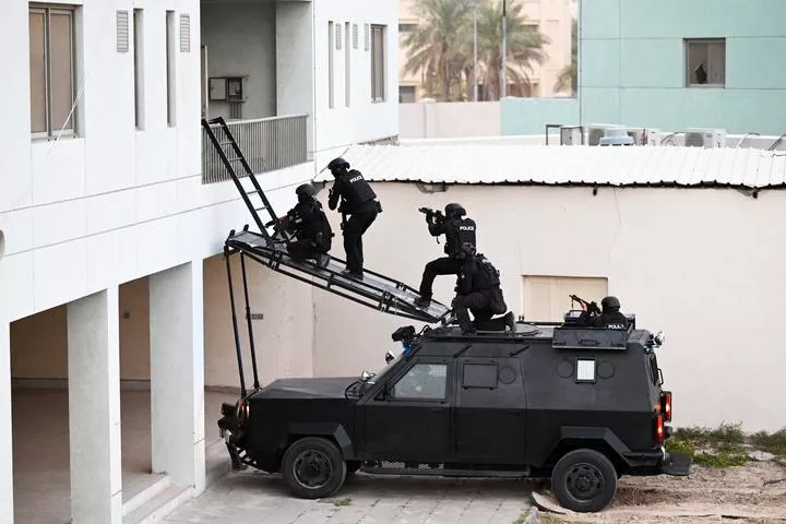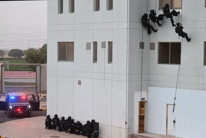 کویت کے الجهراء گورنریٹ میں انسداد دہشت گردی فورس کے اہلکار تربیتی مشق  میں شریک ہیں۔(شِنہوا)