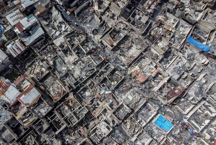 فلپائن کے شہر کوئزون میں کچی آبادی میں آگ لگنے کے بعد جلے ہوئے مکانوں کی ایک تصویر۔(شِنہوا)