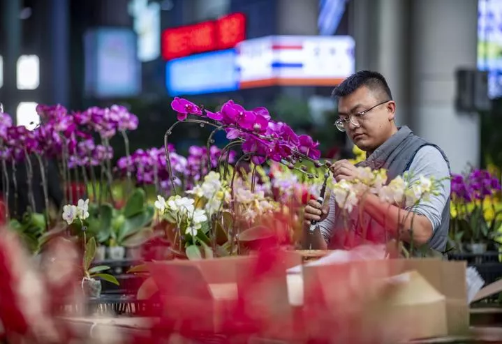 چین ، جنوب مغربی صوبہ یون نان کی کن منگ ڈونان پھول منڈی میں ایک تاجر کام  کررہا ہے۔ (شِنہوا)