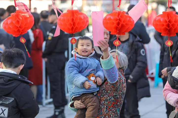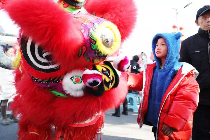 چین کے شمالی صوبے ہیبے کے شہر تانگ شان کے ضلع فینگرون کے لیوشاہی ٹاؤن شپ میں آنے والے لالٹین فیسٹیول کے جشن میں ایک لڑکا شیر کے رقص سے لطف اندوز ہو رہا ہے۔(شِنہوا)