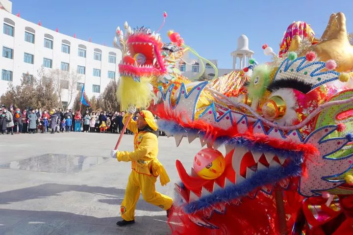 چین کے شمال مغربی صوبے گانسو کی قازق خوداختیارکاونٹی اکسے میں آنے والے لالٹین فیسٹیول کی مناسبت سے لوگ ڈریگن رقص کرتے ہوئے۔(شِنہوا)