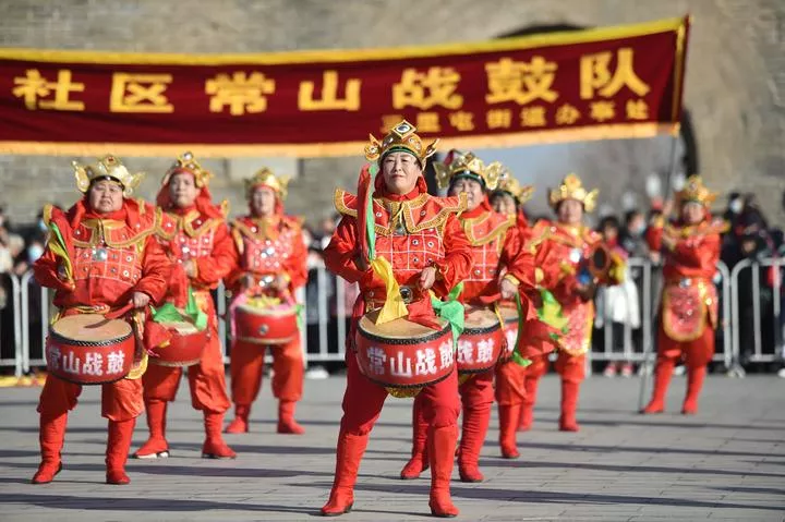 چین کےشمالی صوبے ہیبے کے شہر شی جیاژوانگ کے قدیم قصبے ژینگ ڈنگ میں آنے والے لالٹین فیسٹیول کے جشن میں روایتی چینی ملبوسات پہنے اداکار ڈھول بجا رہے ہیں۔(شِنہوا)
