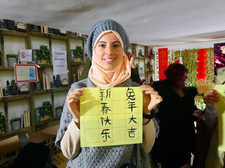 تیونس، تیونس کی ایک طالبہ اورینٹل نالج بک اسٹور میں خود سے لکھے گئے چینی تلفظ "فو" کو نصب کر رہی ہے۔(شِنہوا)