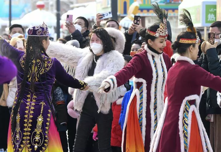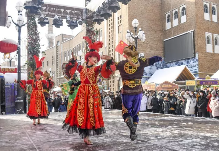 چین کے شمال مغربی سنکیانگ ویغور خودمختارعلاقےکے شہرارمچی کے بڑے بازار میں فنکار اور سیاح رقص کر رہے ہیں۔(شِنہوا)