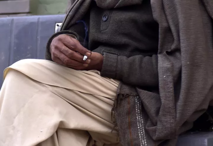 پشاور، ایک شخص نے سگریٹ تھام رکھا ہے۔(شِنہوا)