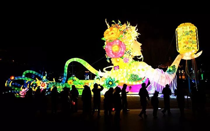 چین کے شمال مغربی صوبہ شانشی کے شہر شی آن میں تانگ پیراڈائز میں لوگ لالٹینیں دیکھ رہے ہیں۔ (شِنہوا)