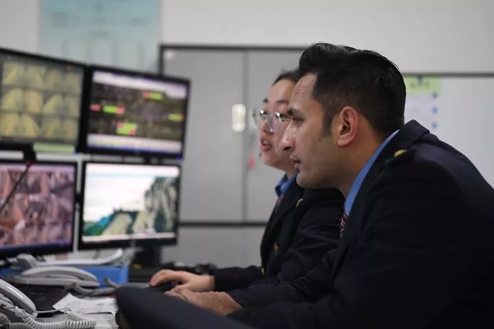 چین، شمال مغربی صوبہ  گانسو کے تیان شوئی جنوبی ریلوے اسٹیشن کے جا مع کنٹرول روم میں محمد فیصل (دا ئیں) مسافروں کی آمدو رفت پر نظر رکھے ہو ئے ہے۔(شِنہوا)